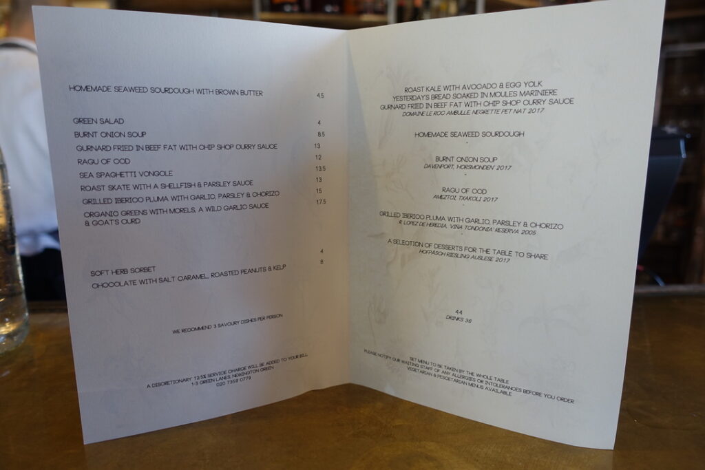 Then came the beautifully fresh gurnard £13, fried in beef fat until it forms a lacy, craggy batter made for maximum dipping action in their nutty chip shop curry sauce. The chef suggests using our hands for this dish – I didn’t argue. It’s adorned with fermented gooseberries and crisp curry leaves for some fragrant, mouth-puckering goodness. We found ourselves licking our fingers clean, coated in luscious oils and curry sauce – a sauce so good I couldn’t resist asking for the recipe, which was kindly scribbled down on a brown paper bag for me.