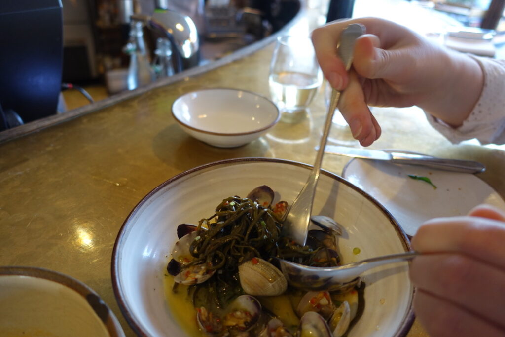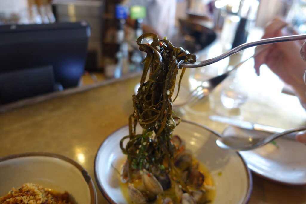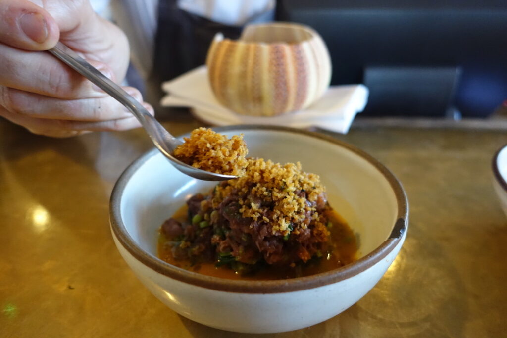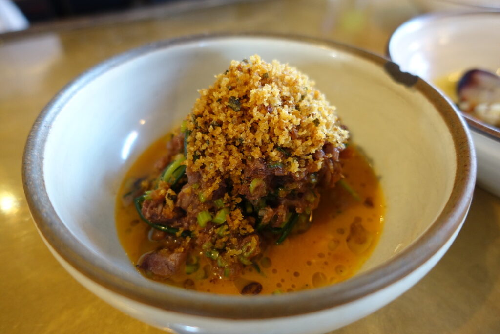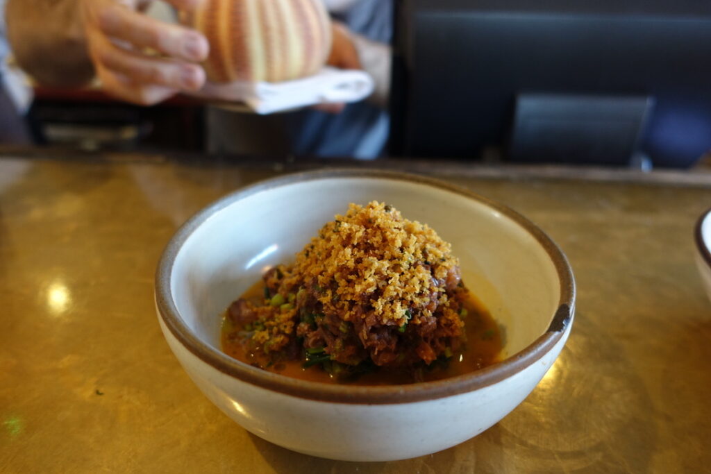 Next came the ragu of cod. Their version is made with tangles of monk’s beard greens instead of pasta, and a meaty, slow-cooked stew of red wine-braised cod head ragu. Crunch comes from toasted bottarga breadcrumbs.