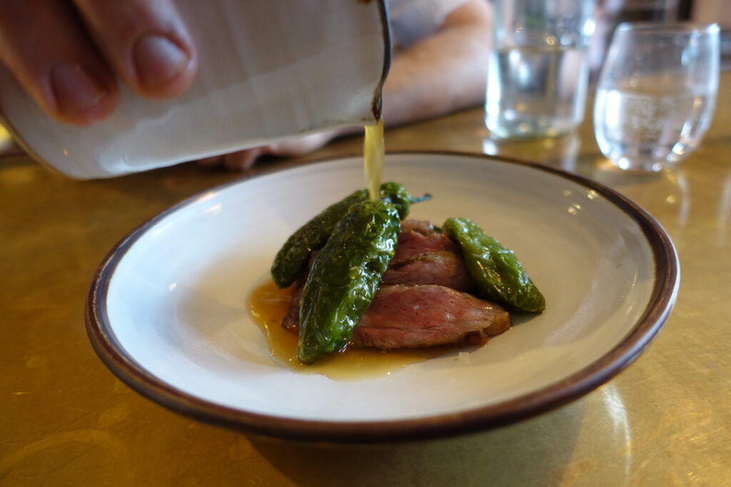 The cheeky wink to Spain came with the Ibérico pluma £15: a melting piece of acorn-fed swine swimming in a chorizo broth poured tableside. Alongside it, a trio of padrón peppers is each filled with contrasting purées – strident garlic, smoky red pepper, and herbaceous parsley.