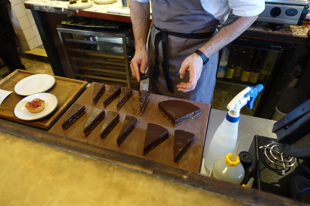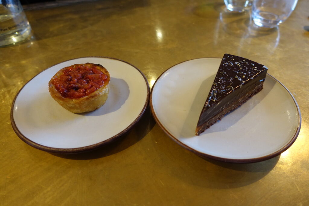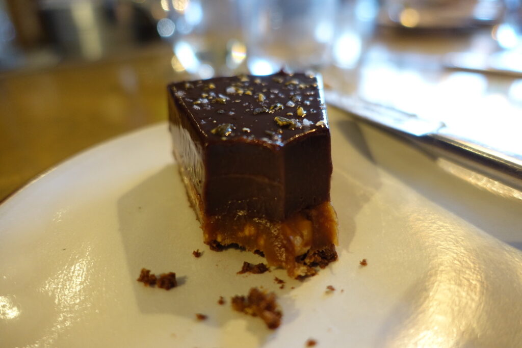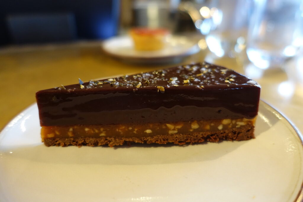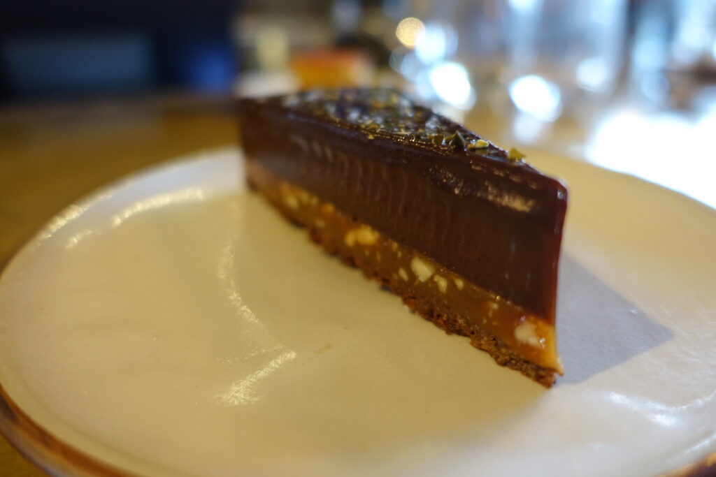 One of the key selling points of sitting at the chef’s bar is that you can eat with your eyes, and what I saw was the pastry chef expertly slicing a chocolate tart into exacting measurements, as if he had a built-in protractor in his hand. Gosh, this tart could be the saviour of Perilla – the very thing that would make me come back. Behold: the base is a chocolate biscuit that snaps, topped with a layer of salted caramel and roasted nuts for crunch, and finished with a glossy, bitter chocolate ganache sprinkled with sea salt.