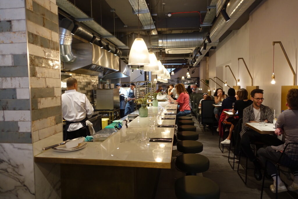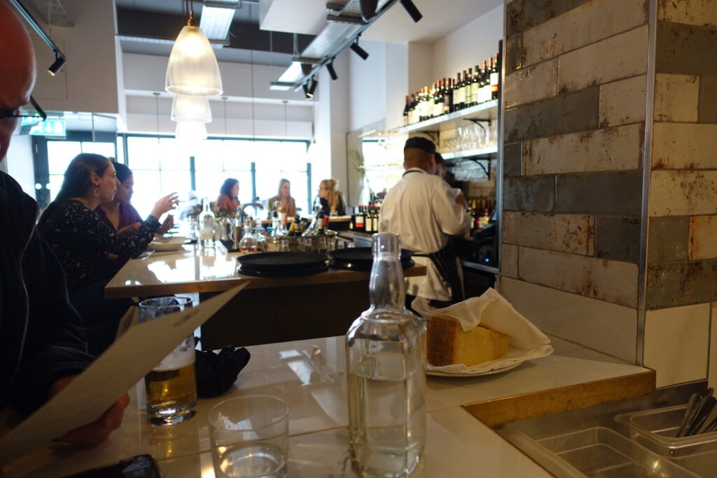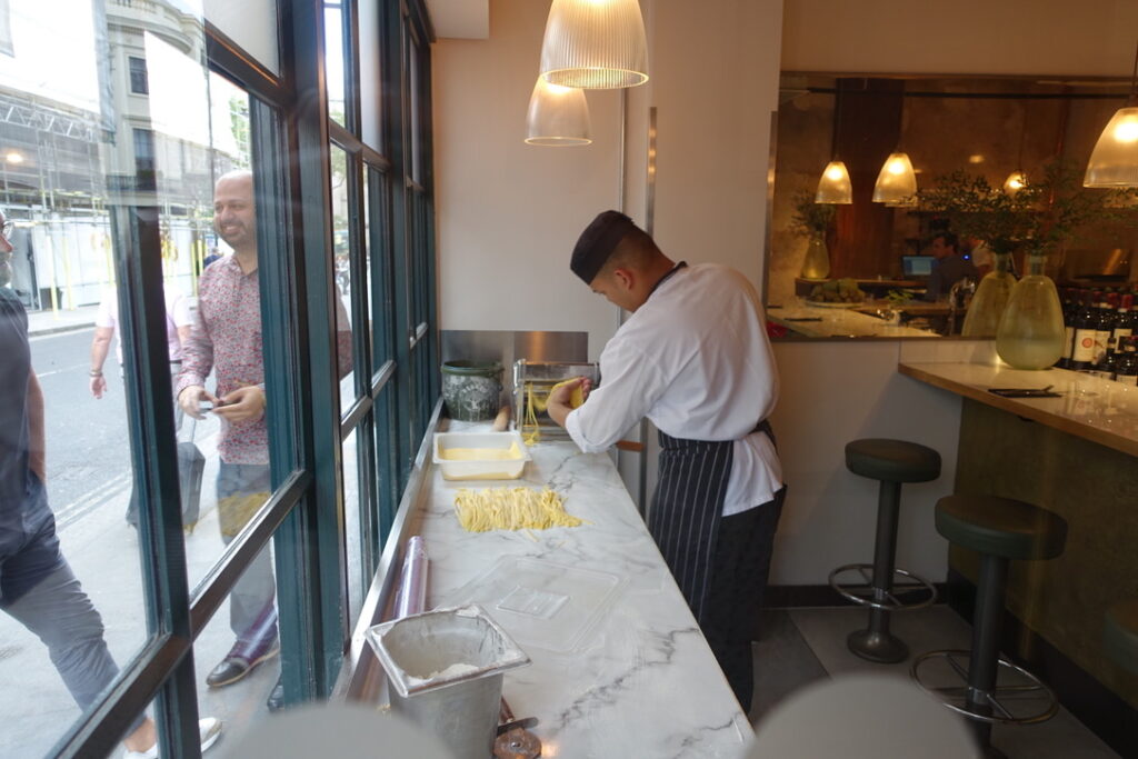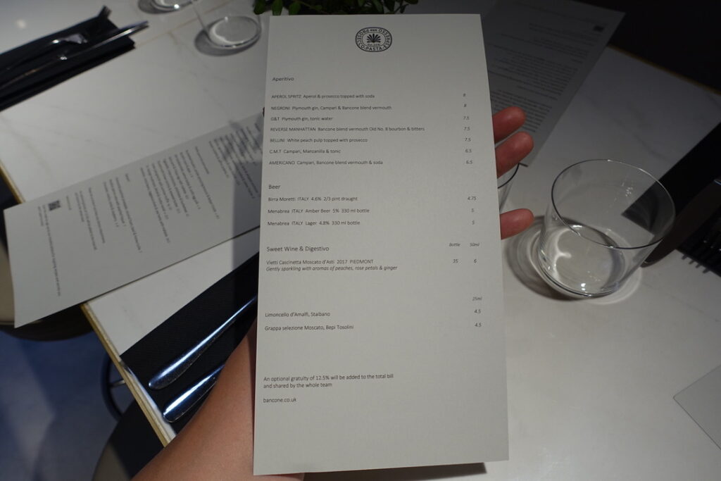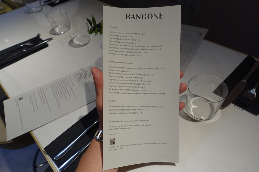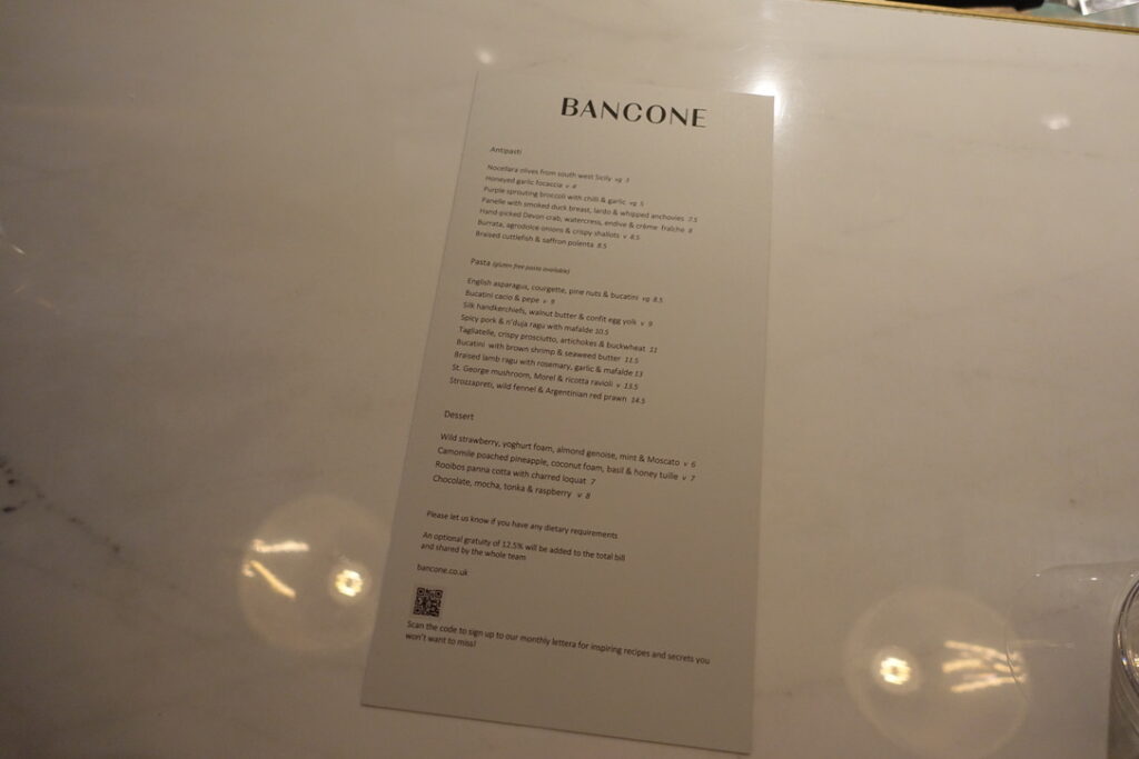 Bancone, meaning “counter,” can simply be described as a pasta restaurant. It’s a 90-seater located near Charing Cross, just seconds away from Barrafina, and it’s been doing its thing since June 2018. I read somewhere that the founder, Will Elner, who earned his stripes running his family’s restaurant Joanna’s in Crystal Palace since 2003, “wanted to bring pasta into the everyday in a buzzy, central London space. I wanted to bring fine dining quality to the scale, pace, and price of the casual dining market, which means our menu is full of flavour and expertise, but the dishes are affordable, and the experience can be as quick or as long as you wish.” I can definitely get excited about that. The head chef is Louis Korovilas, who cooked at Michelin-coveted Pied à Terre and spent five years at Locanda Locatelli. Of course, there is a long counter overlooking the kitchen that takes center stage. It’s flanked by booths that seat four, with seats resembling the rear bench of a vintage car – I say they can seat four, but in reality, my muffin top took up at least two of the spaces. Now here’s to my review.