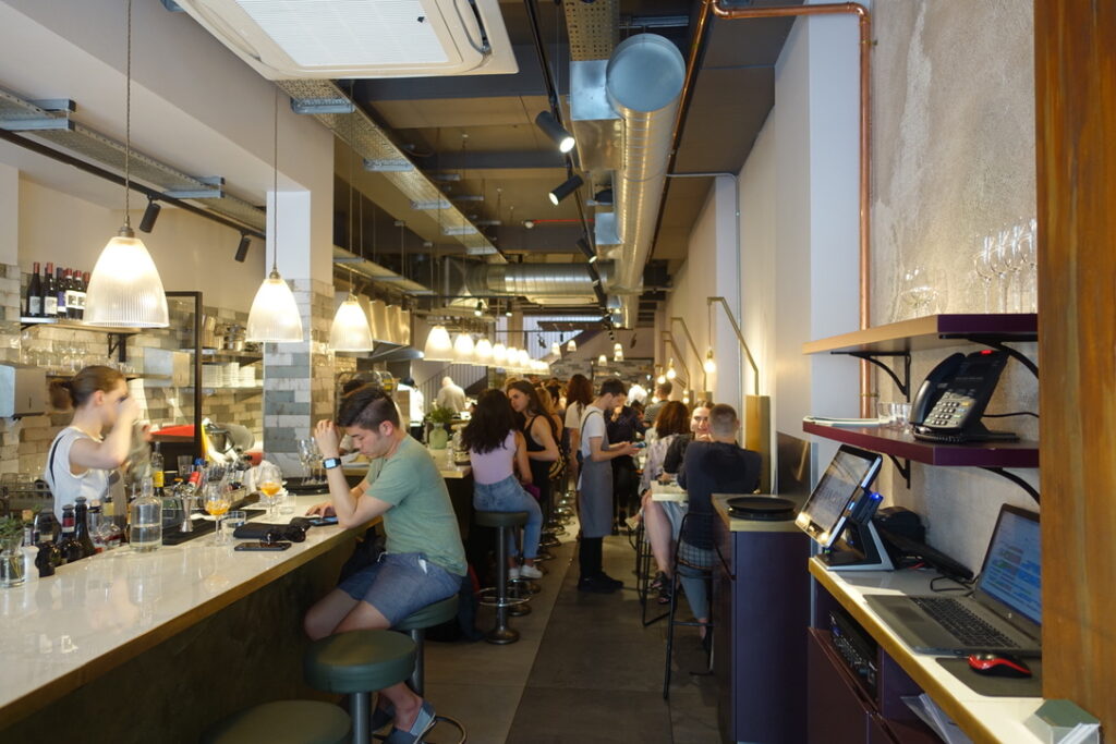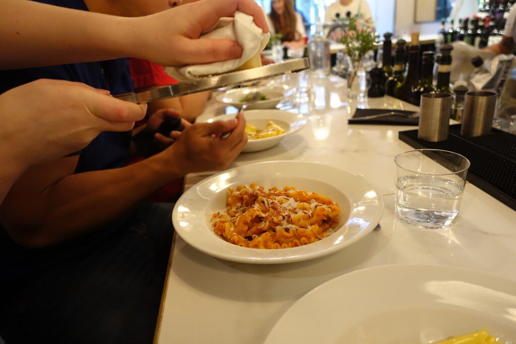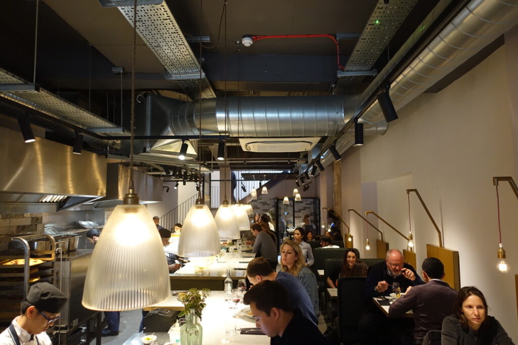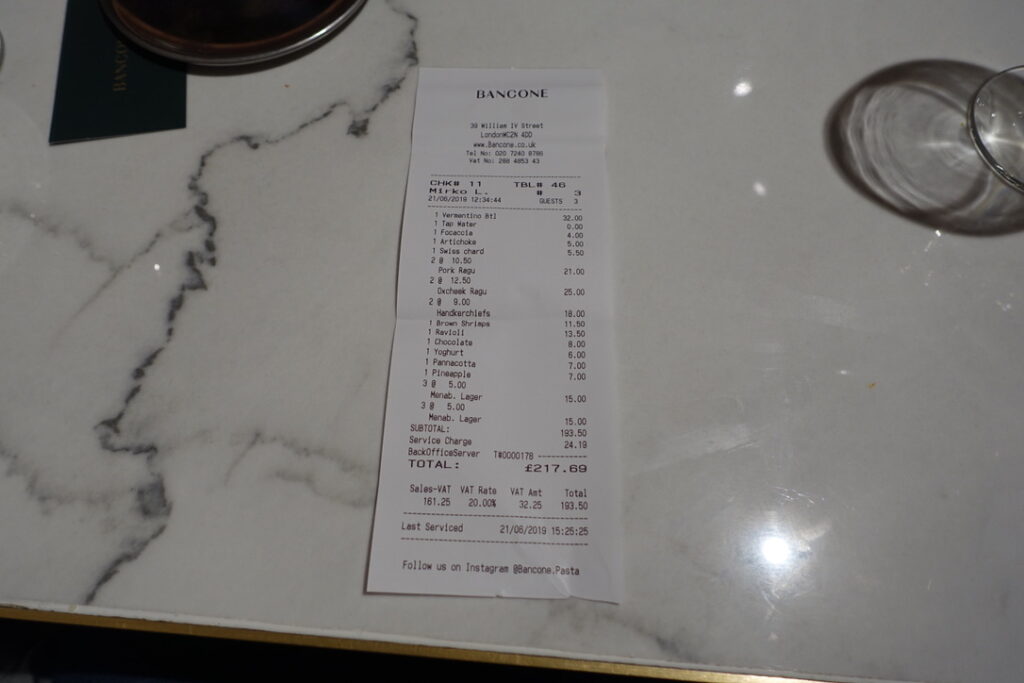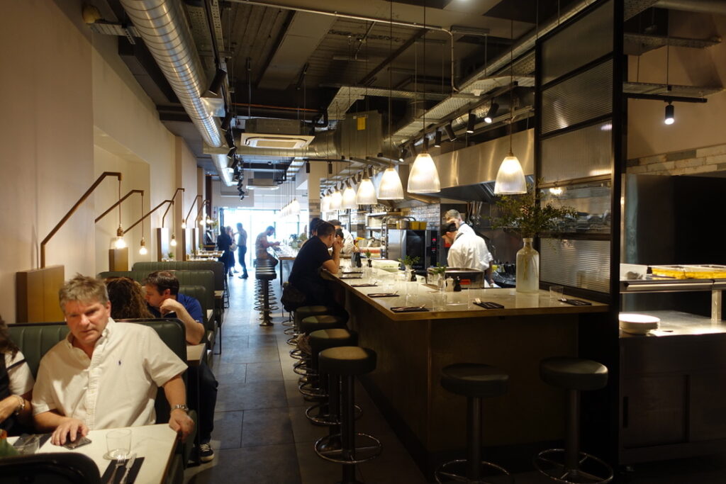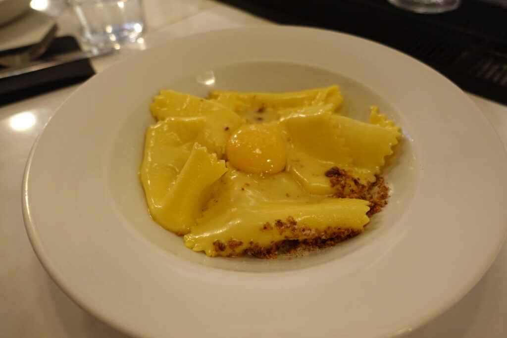 Bancone, meaning “counter,” can simply be described as a pasta restaurant. It’s a 90-seater located near Charing Cross, just seconds away from Barrafina, and it’s been doing its thing since June 2018. I read somewhere that the founder, Will Elner, who earned his stripes running his family’s restaurant Joanna’s in Crystal Palace since 2003, “wanted to bring pasta into the everyday in a buzzy, central London space. I wanted to bring fine dining quality to the scale, pace, and price of the casual dining market, which means our menu is full of flavour and expertise, but the dishes are affordable, and the experience can be as quick or as long as you wish.” I can definitely get excited about that. The head chef is Louis Korovilas, who cooked at Michelin-coveted Pied à Terre and spent five years at Locanda Locatelli. Of course, there is a long counter overlooking the kitchen that takes center stage. It’s flanked by booths that seat four, with seats resembling the rear bench of a vintage car – I say they can seat four, but in reality, my muffin top took up at least two of the spaces. Now here’s to my review.