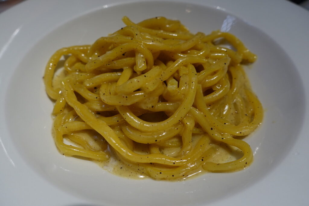 Bucatini cacio e pepe £9 – literally means pepper and cheese, the latter a semi-soft variety made with sheep’s milk that cloaks the bucatini, a hollow-centred spaghetti that gets stuck in your teeth – all the things I like.