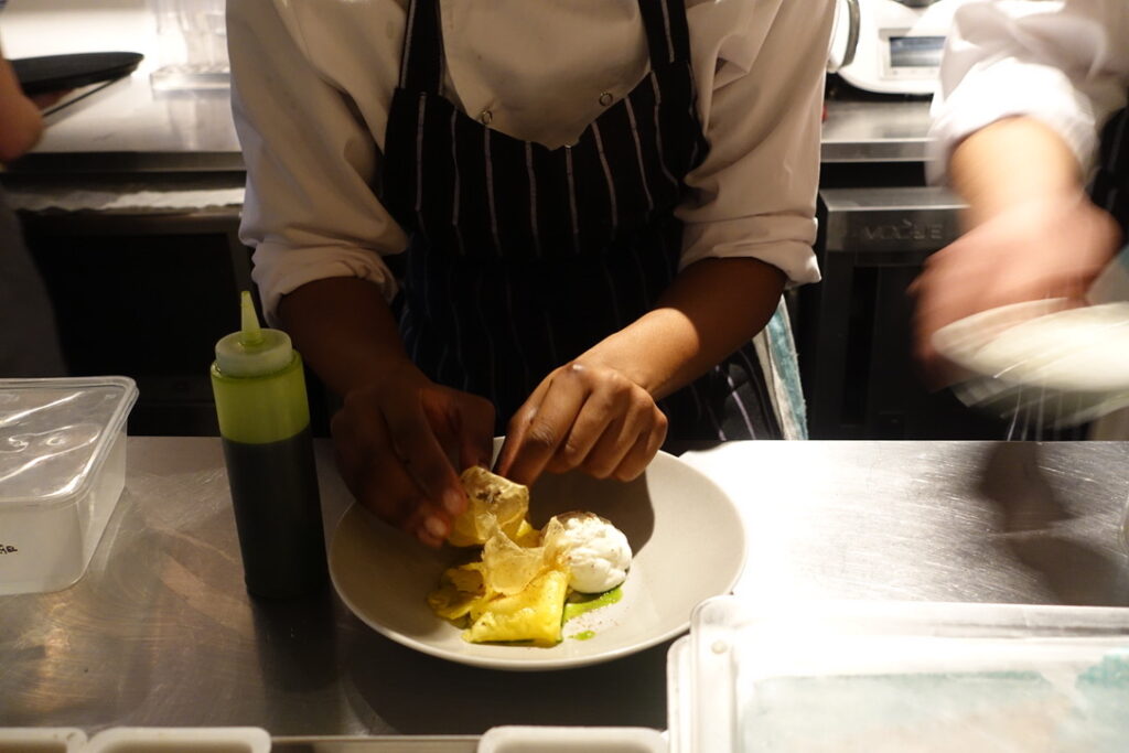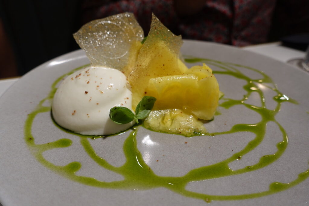 Here is the chamomile-poached pineapple with coconut foam, basil, and honey tuile priced at £7. It’s clear the pastry section here comes with a deft touch and real pedigree. The intent seems to be creating desserts that are light and refreshing – the perfect counterpoint to the gluten-fuelled debauchery you won’t be able to resist during the main course.