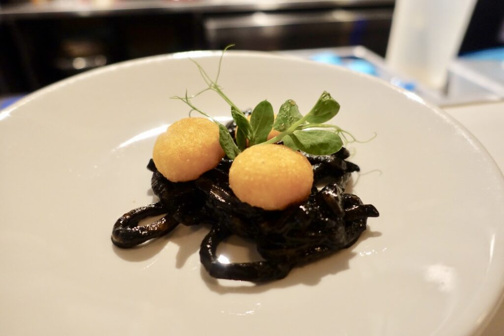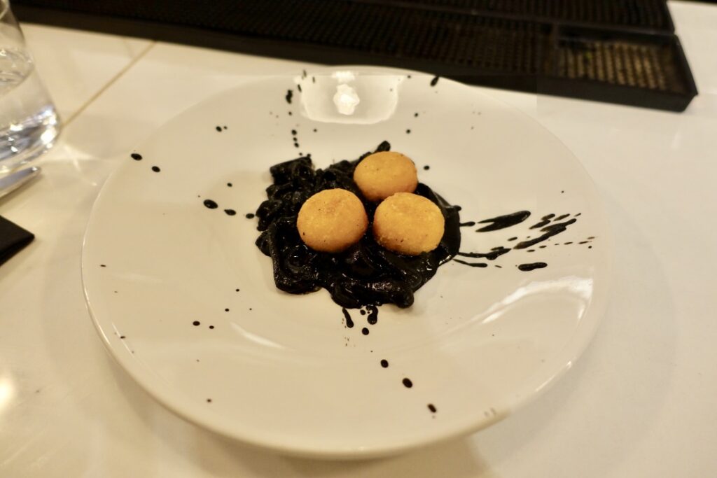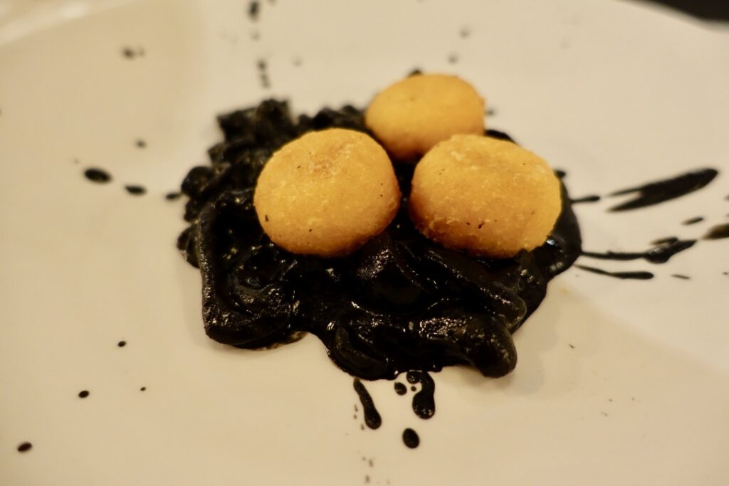 First came the braised cuttlefish with saffron polenta balls £7.50, a classy dish of coal-coloured rings of sweet protein.