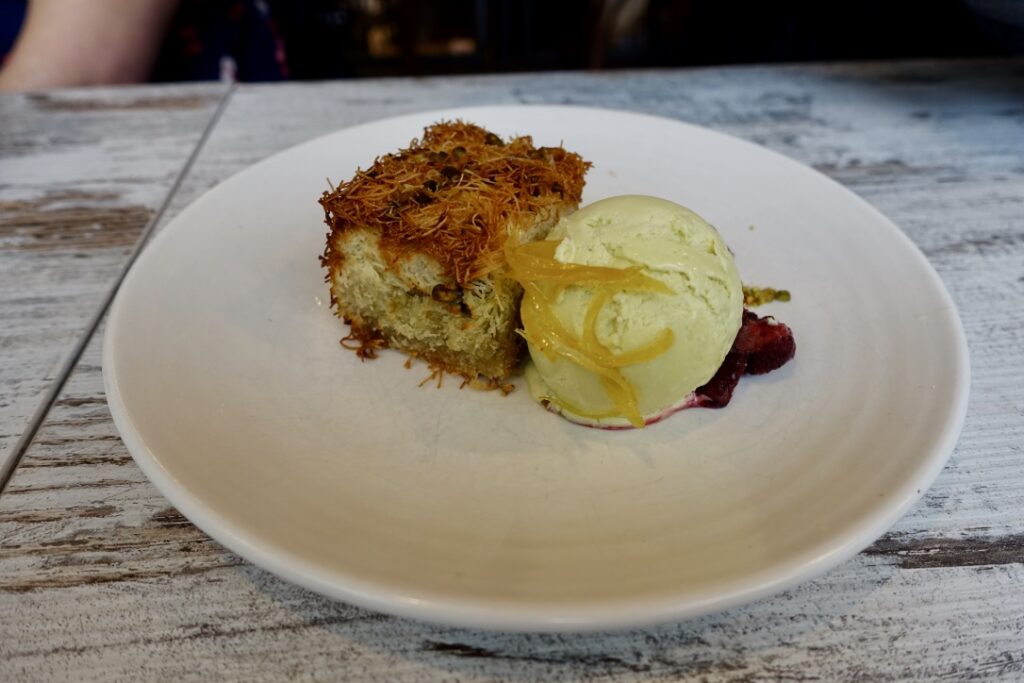 Something else quite delicious was the pistachio & honey kataifi £7.50 – a baked, buttered dough with a faint hint of spice and a drizzle of sugar syrup that soaks the base. The pistachio ice cream was a marvellous addition, as were the teaming frozen raspberries.