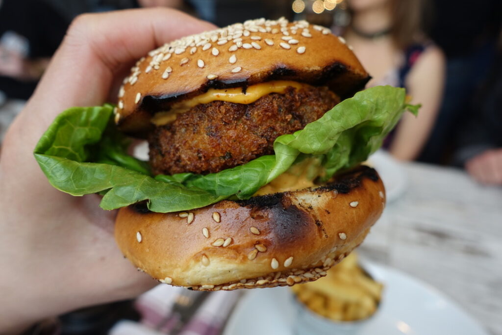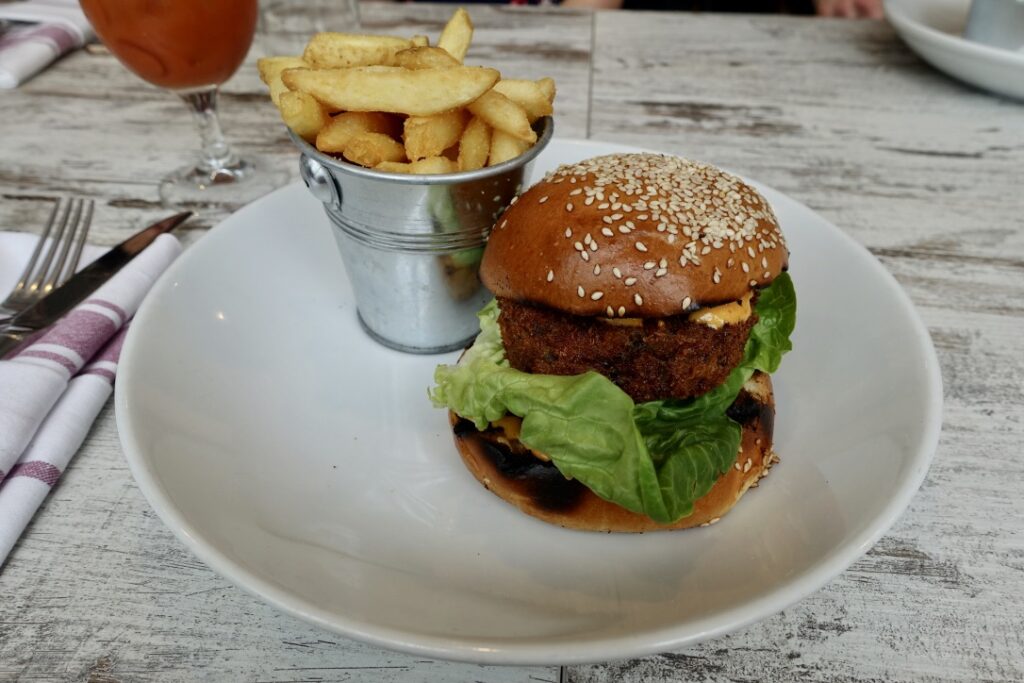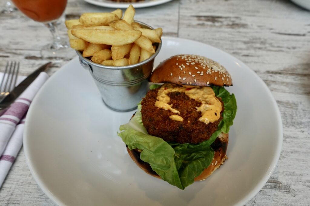 From the fishier side, there’s the “made @ home” shrimp burger (£17) with sriracha mayo, baby gem, and fries. The star of the dish is the shrimp patty – panko-coated, with solid lumps of pert prawns and a lustful hit of strident coriander. Give me a stack of them and I’m anyone’s. The bun, a parched companion, was either too big or the patty too small; not even the soak of sriracha could help, and I found myself leaving most of it. The chips did exactly what they said on the tin too – probably double-cooked, and entirely finishable.