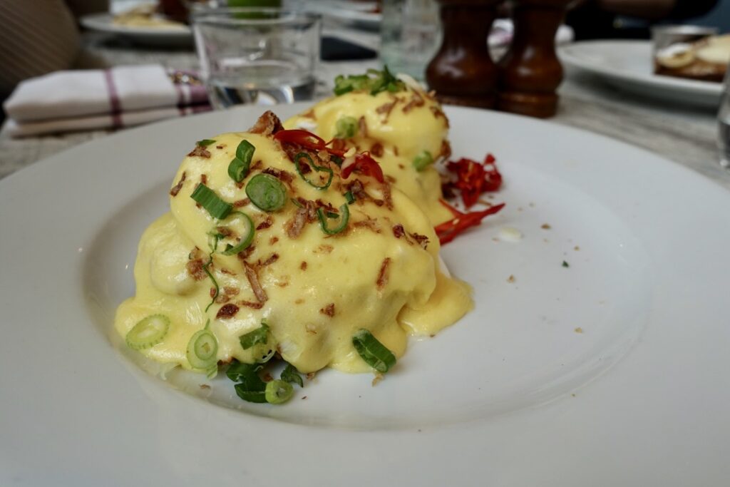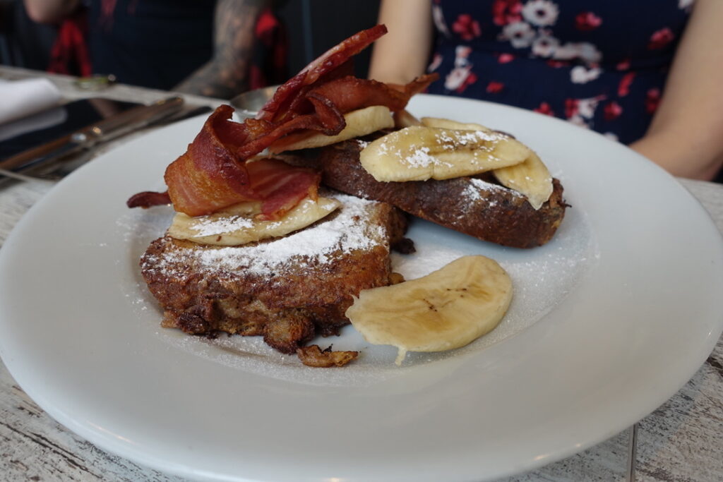 Other folk get the French toast with “made @ home” brioche, bacon and banana £11.50 and eggs benny £12.50.