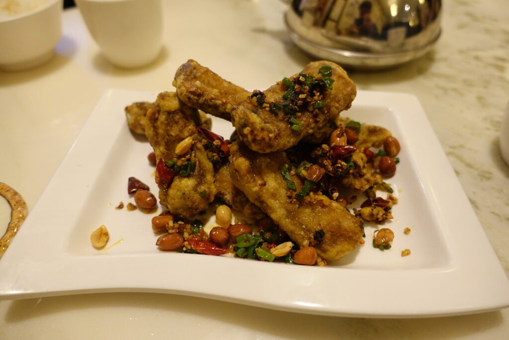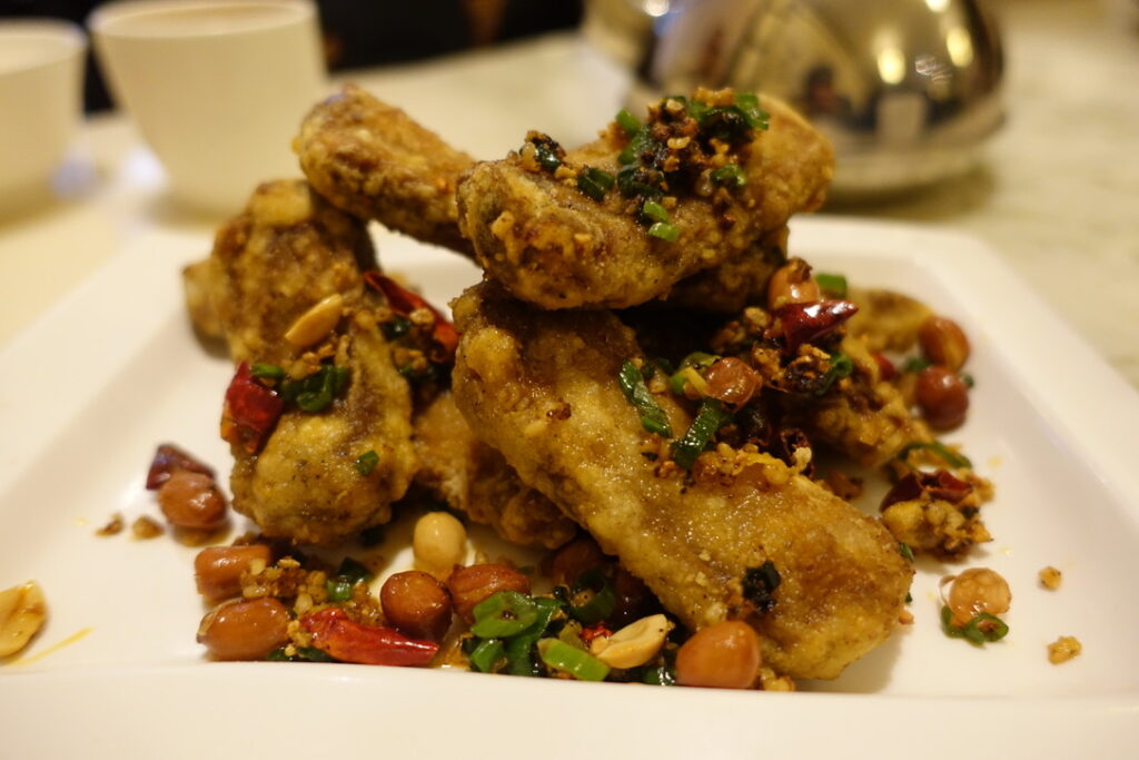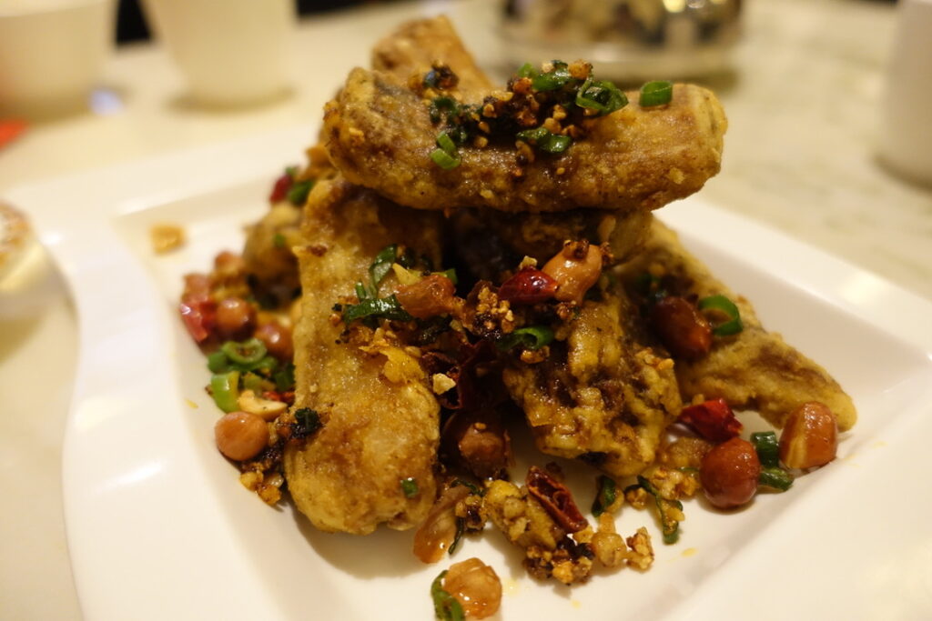 Sichuan-style spare ribs £9.80 are spun through the wok with chopped garlic, peanuts, chillies, and spring onions – but they demand deft nibble work to prize out what feels like scant meat beneath an abundance of crisp batter.