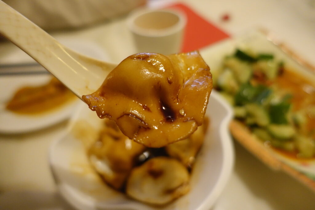 We order their signature pork and veg dumplings £6.20. The wrappers are thick-set and briefly blanched, then sloshed tableside with the funk of black vinegar, soy, and hot oil. There’s a joyous slap of flavour in them.