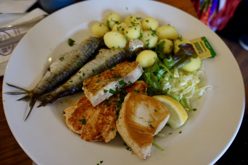 Grilled fish medley £14.95 came with a half-arsed salad of rocket and lettuce – I mean, where’s the dressing? The teeny new potatoes get a dusting of chopped parsley and one of those foil-wrapped blocks of butter that served no purpose, as the spuds were cold before we could even attempt to melt it in. Of the fish, there is grilled salmon and swordfish; catch me in a pugnacious mood and I’d say they were overcooked to the point of drying. I was in a pugnacious mood. Then there were the sardines, I didn’t ask for scales on my fish, but I got them. Lovely.